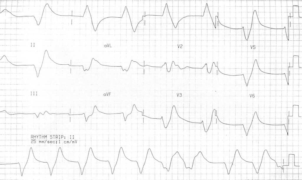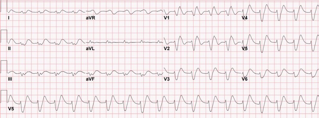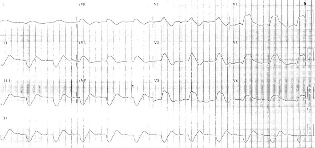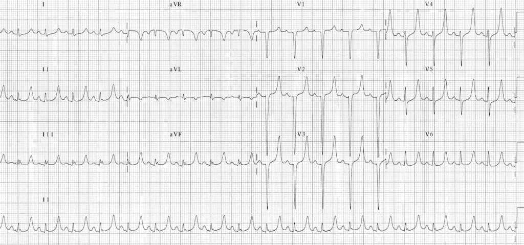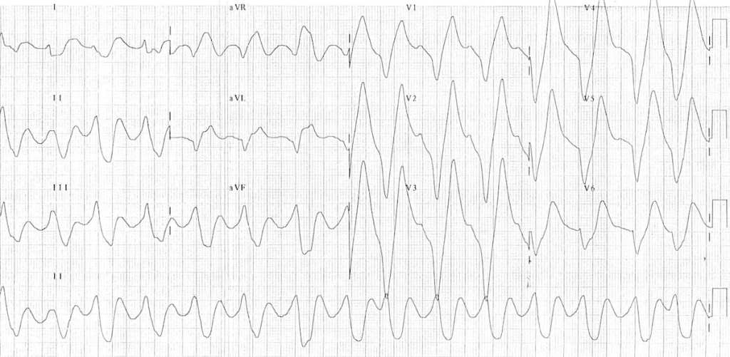 Mas vamos analisar esse ECG com mais atenção, o paciente estável, tendo o cuidado para não iniciar medicações anti-arrítmicas como amiodarona imediatamente pelo risco de tornar pior o que já está bem ruim.