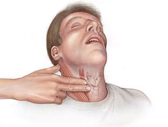 A mão é colocada de uma forma que a porção média dos dedos fiquem sobre a região tireoide, e as pontas dos dedos médio e indicador alcancem o mesmo sulco entre a cartilagem tireoide e o músculo esternocleidomastoideo, conforme figura acima.